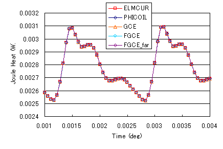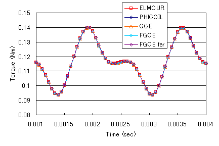 Fig.5, 6にそれぞれのモデルで得られたトルク波形と磁石一個分のジュール発熱波形を示します。TableIにそれぞれのモデルで得られた平均トルクと磁石一個あ たりの渦電流損を示します。これらを見ると、このモデルでは、多少の違いはありますが磁場ソースに関わらずよい一致を示してします。値は小さいですが ELMCURモデルとPHICOILモデルの波形とFGCEモデルとGCEモデルの波形では多少のずれが見られます。これはFGCEモデルとGCEモデル ではコイルエンドも考慮しているためであると思われます。また、ステータ表面に与えるコイルエンドの影響を無くしたFGCE_farモデルでは、 ELMCURとPHICOILに非常に良く一致しています。これより、コイルのATが一致していれば、ELMCURのようにコイル形状を忠実に表していな くても、非常に簡易的にFGCEの線電流で近似して十分であるようです。