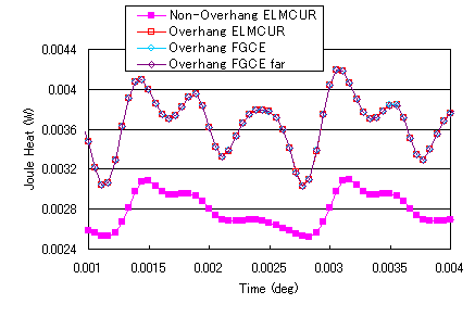 また、オーバーハング無しのELMCURモデルの結果と比べて見ると、トルク、ジュール発熱共にオーバーハング無しの結果よりもかなり大きくなっています。