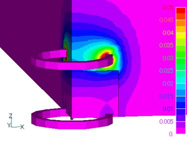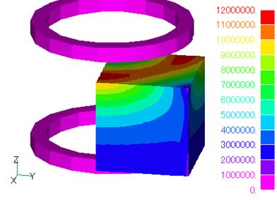 2ポテンシャル法では、磁場ソースを表す電流源は変形ポテンシャル内または解析領域外に定義されれば良いため、メッシュと独立に形状を定義できます。したがって、メッシュは電流源の形状にとらわれることなく、容易に分割することができます。また、メッシュと独立ですので、位置を容易に変更することも可能で、電流源の運動解析にも利用できます。この解析法では、変形ポテンシャル内では磁気ベクトルポテンシャルを磁場ソース(COIL)によるソースポテンシャルと、トータルポテンシャル内の磁性体磁化や導体渦電流によるものなどによる変形ポテンシャルとを分離し、前者はビオ・サバール則の積分により、後者を有限要素法により計算します。コイル近傍の磁場はビオ・サバール則の積分でメッシュと独立に計算されますので、コイル近傍のメッシュが粗かったり、メッシュ外にあったりする場合でも精度を出せるのが利点の1つです。