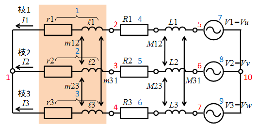 Fig.1の橙色の部分は,要素分割され有限要素法でコイルとして磁界解析を行う領域です。また,回路の各相に直列な部分を枝と呼び,それぞれの枝を枝1,枝2,枝3とします。以降,素子,電源等の添字は各枝番号に対応します。このメッシュ内のコイルの抵抗($r_1$,$r_2$,$r_3$), 自己インダクタンス($l_1$,$l_2$,$l_3$), 相互インダクタンス($m_{12}$,$m_{23}$,$m_{31}$) はEMSolution内部で考慮されるので,ユーザがその値を指定する必要はありません。(コイル抵抗はEMSolutionで計算せずに,外部抵抗の一部として与えることもできます)。