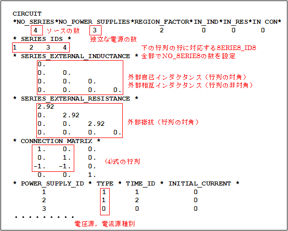 Fig.6にCIRCUITの設定を示します。外部抵抗,外部インダクタンスは行列として入力します。ソースの数はNO SERIESで設定し,その中で独立な数をPOWER SUPPLIESとします。また,(4)式の接続行列をCONNECTION MATRIXとして設定します。
