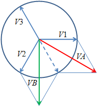 電圧は(5)式の閉ループの電圧$V_A$、$V_B$を入力値とするため,その求め方を示します。Fig.7に三相対称電圧である枝の電圧$V_1$、$V_2$、$V_3$のベクトルを示します。(5)式より,例えば$V_A$は$V_1$-$V_3$であるから,赤矢印のように大きさが$V_1$の√3倍、位相が$V_1$に比べて30度遅れたベクトルになります。同様に,青矢印で示される$V_B$の大きさは$V_1$の√3倍であり、位相は$V_1$に比べて90度遅れています。従って,Fig.8のように電圧の大きさは100√2Vになる.これは,Y結線をΔ結線に変換し,さらに閉回路とするため一辺を取り除いたV結線に変換しているのと等価となります。なお,大きさに負の符号が付いているのは,NETWORKの定電圧電源の方向の定義が逆になっているためです。