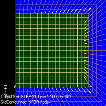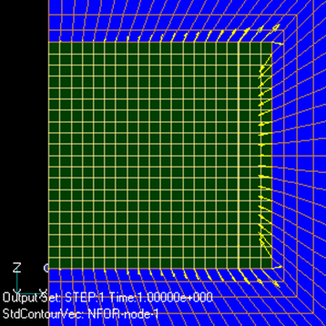 Fig.5、Fig.6に両メッシュでの磁束密度の分布を示します。ほとんど差異が認められません。また、Fig.7、Fig.8に節点力分布を示します。この場合も差異は小さなものです。ところが、トータルの力としては、Fig.2の電流0の非対称メッシュでは誤差として電磁力が出てきます。これは図からも明らかなように、本来上下対称に節点力が分布するはずなのですが、メッシュのゆがみにより、上下対称性が崩れ打ち消し誤差が出るためと考えられます。Fig.7にコイル電流が0.1A*280Tの場合を対称メッシュで示しますが、節点力分布の変化はわずかです。このことは、各節点力が、トータルの力と比べても大きいことを示しています。このように、磁石自身の作る磁場よりコイルの作る磁場が小さい場合は、メッシュの少しの非対称性でも誤差が大きく出てしまいます。