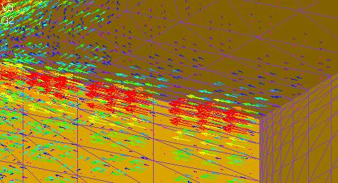 例えば、Fig.1ような直方体にz方向に一様な交流定常磁場が印可された場合を考えます。直方体は一辺$1m,5×10^7S/m$とします。また、磁場は10Hzで1Tとします。直方体一次要素で計算しますと、Fig.1の様な妥当な渦電流密度分布を得ることができます。ところが、四面体に分割し一次要素で計算しますと、結果はFig.2、3、4の様に、電流密度ベクトルが波打ったものになります。