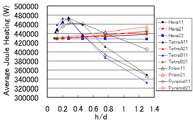種々の要素で解析した場合の、メッシュ幅と平均ジュール発熱量の関係をFig.9に示します。横軸に最小メッシュ幅(h)に対するスキン厚さ(d)の比をとります。各線の名前は要素種、節点次数、辺次数を示します。TetraA、TetraB、Prism、PyramidはそれぞれFig.8の分割(a)、(b)、(c)、(d)に寄るものを示します。