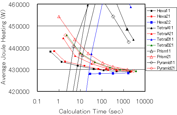例えばHexa11は一次(節点一次辺一次)要素を表します。まず、全ての要素種で メッシュを細分してゆくにつれて同じ値428kWに 収束していることが解ります。しかし、収束の仕方は大きく異なっています。まず、六面体要素では、一次要素と節点二次辺一次はほとんど同じ収束性を示しています。四面体、三角柱およびピラミッド要素の場合は、一次要素と節点二次辺一次要素の収束は大きく異なり、一次要素の収束は非常に悪く、誤差も大きいものとなっています。h/dが0.3程度からやっと収束し出します。それに較べ、節点二次辺一次要素では、誤差の大きさは要素種に異なりますが、直線的に解に収束しています。
