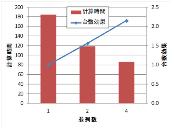 このように,BlockICCG法による並列化は,単純に並列数を上げると計算時間を短縮できるため,有用だと言えます。 なお,台数効果は搭載CPUの性能に強く依存するようです。