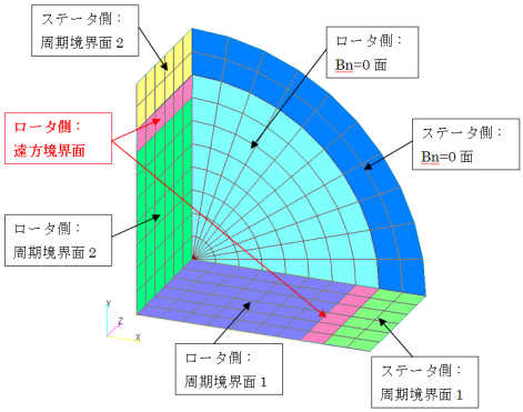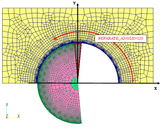 なお,SEPARATE_ANGLEはメッシュ定義位置によらず,X軸からの角度を指定し,ステータ(pre_geom),ロータ(rotor_mesh)共に適用されます。そのため,SEPARETE_ANGLEはメッシュ定義位置(節点の座標)に適用されますので,SEPARATE_ANGLEの指定内にステータとロータのメッシュ定義位置が来るように作成してください(ロータの初期位置は時間関数で位置変更できます)。また,スキュー等によりメッシュ全体で360度を超えるモデル(180度以上スキューされるモデル)では,本機能でも180度回転周期対称条件は設定できませんので,360度モデルで解析してください。SEPARATE_ANGLEの指定が正しいかは,先の境界面の面要素出力機能で周期境界面を確認して頂ければと思います。