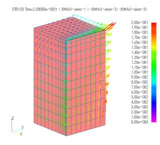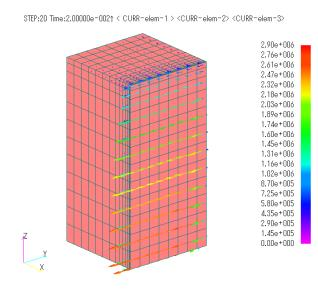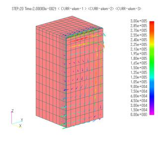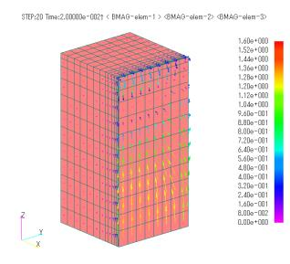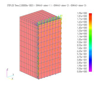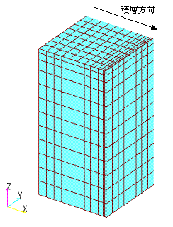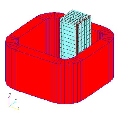 これは、鋼板での積層方向の渦電流分布は一様で、磁場が一定とみなせる場合、すなわち低周波領域で鋼板における表皮効果が十分小さい場合に適用可能です。 例として、Fig.1に示す"COIL(外部電流磁場ソース)を用いた静磁場解析"などで使用している「電気学会三次元静磁界検証モデル」を用いて、渦電流を含む非線形過渡解析を行います。積層鉄心がx軸方向に占積率96%で積層されているとします。このとき、積層鉄心表面、および角部には磁束密度が集中しますので、その部分のメッシュは多少粗いですが、鋼板厚さ程度に分割しています。