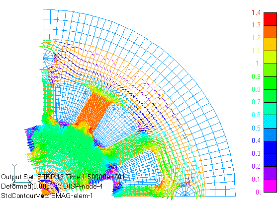 ファイルinputでは、境界条件(90度反対称周期境界条件)、スライド面の運動方向の分割、磁石の磁化、回転速度、磁性材の特性等を入力します。スライド面の分割は、メッシュの分割と同程度にして下さい。スライド面の運動方向分割幅がメッシュ分割幅の1/2程度以下になりますと計算が不安定になります。計算は、入力に従い回転を与え、連続的に行われます。今の場合、渦電流を含まない静磁場解析ですので、回転速度は関係ありません。
