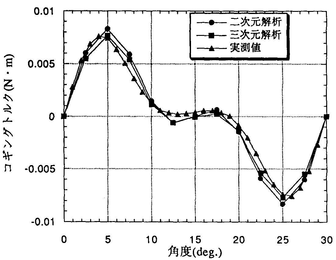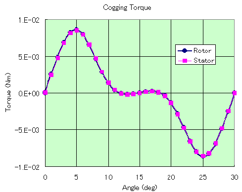 Fig.3はロータが15度回転したときの磁束密度分布矢印図です。Fig.4には節点力の分布を示します。主としてステータとロータが引き合う力となります。回転方向のトルクは、これらの回転方向の力を積算して導出します。コギングトルクの角度依存性の計算結果をFig.5に示します。 Fig.6に実測値と他のプログラムによる結果を示しますが、二次元解析のため若干大きくなっていますが、良く一致しています。Fig.5にはロータ側とステータ側の積算トルクを両方プロットしていますが、良く一致しています。本来作用反作用で一致するべきものです。