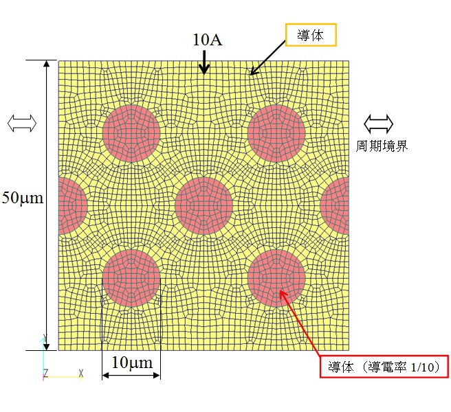 Fig.1に示す多孔質を模擬した導体モデルを用いて,二次元解析を行います。上面から10Aの直流電流を印加し,粒状の導体を周りの導体の導電率の1/10としています。左右方向は周期境界条件としています。 Fig.2に電流密度分布図を示します。導電率が10倍異なるため,ほぼ粒状導体を避けるように電流が流れていることが確認できます。