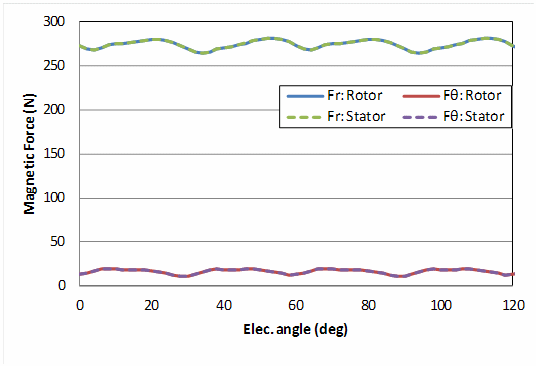 本機能を使用すると,outputファイルに出力されるベクトル量も任意座標系で出力されます。 Fig.4に,outputファイルに出力された電磁力の径方向成分$F_r$ ,周方向成分$F_θ$を示します。ここで,ステータとロータの電磁力は作用反作用により一致しますので,ステータの電磁力は符号を逆転して示しています。これより,径方向成分の電磁力が周方向成分に比べてかなり大きいことがわかります。周方向成分の電磁力にロータ径(正確にはギャップ中心までの距離)を掛けたものがトルクと一致することを確認しています。