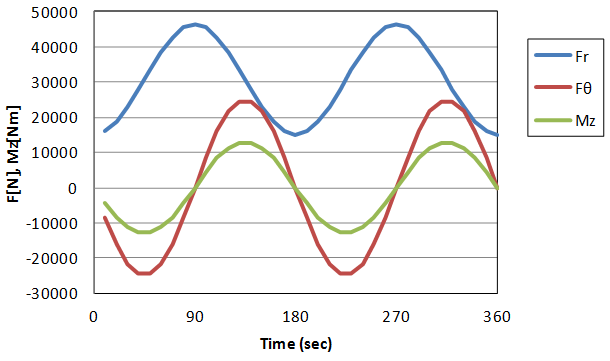 原点での円筒座標系での磁性体円柱に働く径方向電磁力$F_r$と周方向電磁力$F_θ$とZ軸周りの電磁力モーメントはFig.6のようになります。径方向電磁力が大きく,常に正の力となっています。円筒中心はX=1mですが磁性体円柱は大きさを持っている(質点ではない)ため,$F_θ$とMzに差は見られますがどちらも正負に振動する力となっています。
