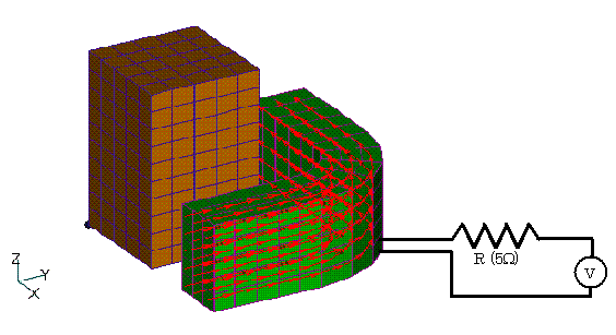 本モデルは、"定電圧電源を接続したコイルの解析"で説明を行っています。電圧源が5Wの抵抗を介してコイルに接続され、中心鉄心を励磁します。コイル、鉄心および周辺の空気における磁場が有限要素法で解析されます。有限要素モデルでは対称性により全体の1/8を解析しています。コイルに流れる電流値は解析の結果として求められます。電圧源には、Fig.2の赤実線のようにステップ的に電圧が加えられるものとします。従来のバージョンで解析しますと、コイル電流波形はFig.3の青破線のように計算されます。黒実線は解析解でかなりな誤差が現れます。今の解析は線形解析としていますので、解析解は、抵抗およびインダクタンスから簡単に求めることができます。
