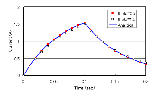 時間方向の積分に対してEMSolutionでは場の計算とは別に、回路計算に対してq値を与えられるようにしています。 q=0.5のときは中心差分、q=1.0のときは後退差分となります。Fig.4に示しますように、q=1(後退差分)では精度が下がります。ただ、q=0.5(中心差分)では、 計算が不安定になる場合がありますのでご注意ください。なお、本資料の解析では、q=0.5で大丈夫です。
