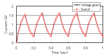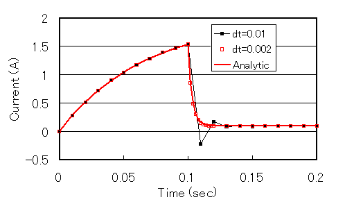 最後に、最も重要な改良点ですが、解析時間ステップ間隔を可変としました。例えば、スイッチを使い、その開(Off)時の抵抗を大きくしますと、電流が急変します。そのような場合、Fig.8黒線のように時間間隔が大きいと振動が現れ、誤差が大きくなります。Fig.8の解析はFig.1の電源にスイッチを直列に挿入し、スイッチを切った場合を計算しています。スイッチのOff時の抵抗を1kΩとしています。赤線の結果は、スイッチOffからの0.02秒の間の計算時間間隔を1/5にしたもので、過渡状態を精度良く模擬できています。