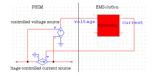 PSIMにおいては、EMSolutionの電圧源に対応するものが電流源(Voltage-controlled current source)によって表されます。その両端の電圧はVoltage-controlled voltage sourceによって得られ、EMSolutionに渡されます。