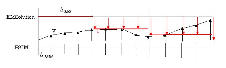 電磁場解析を行うEMSolutionと電気回路計算を行うPSIMの時間ステップを等しくするのが好ましいと思われますが、そうしますと多くの場合PSIMで解析される電気回路系の時定数がEMSolutionで解かれる電磁場系の時定数に比べ小さく、EMSolutionの時間ステップをPSIMの時間ステップに合わせて小さくする必要があります。しかし、EMSolutionの解析は有限要素法解析を含み、PSIMの計算に比べ多大の計算時間が必要となります。このため、実際にはFig.2に示すようにEMSolutionの解析時間ステップは、PSIMの時間ステップに比べ大きくせざるを得ません。EMSolutionの解析時間ステップ$Δ_{EMS}$はPSIMの時間ステップ$Δ_{PSIM}$の整数倍として設定します。PSIMではEMSolutionからの電流入力により、$Δ_{PSIM}$のステップで電圧が計算されますが、EMSolutionでは$Δ_{EMS}$毎に電流を計算し、$Δ_{PSIM}$間はその値がホールドされるとしてPSIMに引き渡します。EMSolutionでは陰解法回路計算を行いますので、比較的大きな時間ステップでも不安定性は起こらず精度が保たれると考えられます。ただし、PSIMでは電流値が階段状となりますので、注意が必要です。