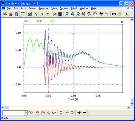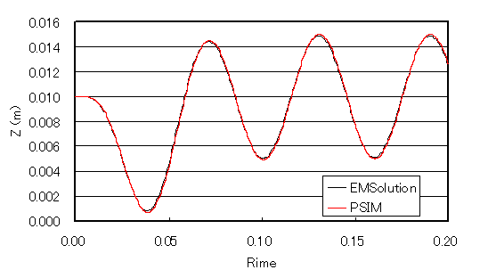 前項とは逆に、運動方程式のみをPSIMに計算させた場合を示します。運動方程式のPSIMモデルは、Fig.3のものを使用しております。 EMSolutionではプランジャーが壁面で反射した場合も計算できますが、PSIMでそれをモデル化するのは容易ではありませんので、壁面に到達するまでを模擬しました。