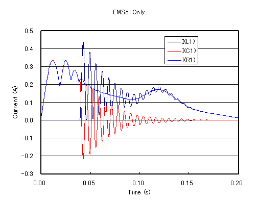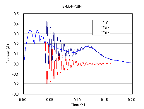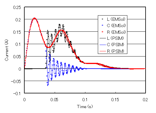 EMSolution内部には、有限要素法と直接連成するFEM要素が含まれ、他のいくつかの回路要素を含めることが出来ます。このため、PSIMとEMSolutionのどちらに回路要素を含ませるかには自由度があります。EMSolutionに用意されている要素(例えば抵抗、インダクタンス、キャパシタンス等)は、EMSolution側に入れたほうが良いようです。これは、EMSolution側では電圧源となっており、EMSolution側の回路はインピーダンスが高いほうが精度が良いと考えられます。