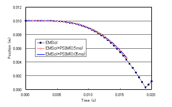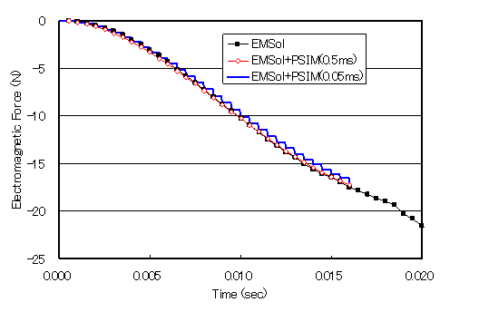 Fig.9、10に電磁力と位置の変化をEMSolution単独で解析した場合と、運動方程式をPSIMで解いた場合の比 較を示します。PSIMの時間ステップをEMSolutionの時間ステップ0.5msとその1/10にした場合について示します。PSIMの時間ステッ プを小さくしますと、電磁力が階段上になるのが目立ちますが、解析上PSIMの時間ステップの間ホールドされるだけで、結果としては大きな差はありません。位置の変化はPSIMと連成しますと若干差が出てきています。これは、Fig.9のように階段状に力が働くとみなされ、電磁力が弱くなった結果と思わ れます。EMSolutionでは、Fig.9でのように電磁力がステップ間で線形に変化するとして位置を求めます。このように、ステップ間でのデータの やり取りや計算法の違いにより、精度が低下することがあると思われます。より緊密な連成が出来ない限りやむを得ないと思われ、精度を上げるには、EMSolutionの時間ステップも小さくしてゆくしかないと考えられます。