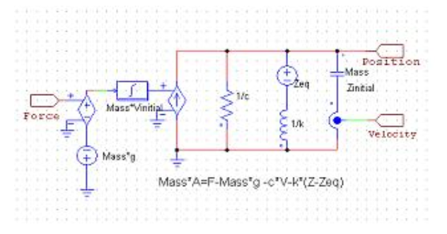 $$\begin{eqnarray} \left. \begin{array}{l} \displaystyle V \leftrightarrow z \\ \displaystyle I \leftrightarrow \int^t_0 ( F – mg ) dt + m v_0 \\ \displaystyle C \leftrightarrow m \\ \displaystyle \frac{1}{R} \leftrightarrow d \\ \displaystyle \frac{1}{L} \leftrightarrow s \end{array} \right\} (3) \end{eqnarray} $$