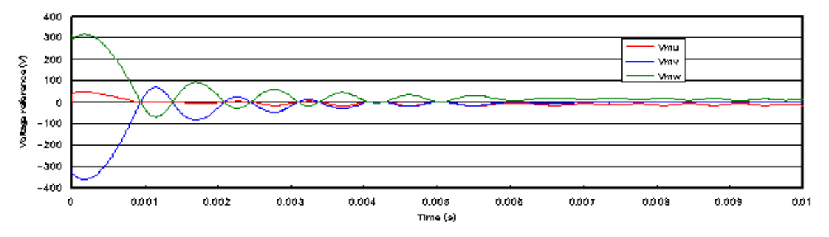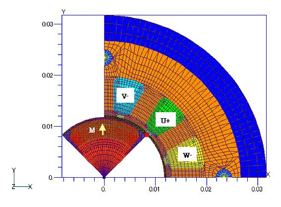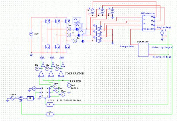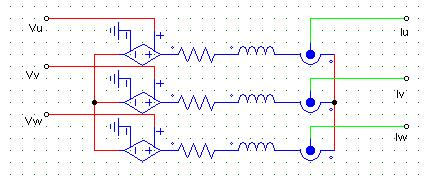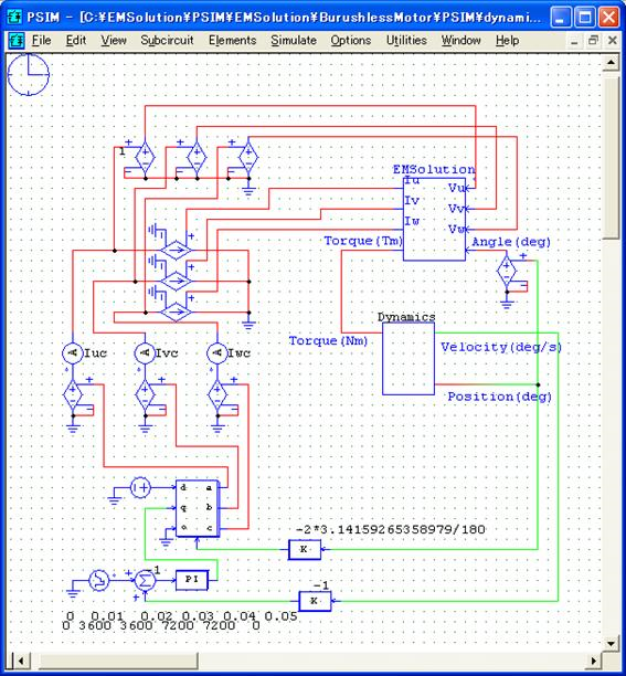 Fig.16に示すモデルを用います。運動方程式はFig.17のようにSubcircuit化しています。このSubcircuitはトルクを入力として、回転位置および速度を出力します。制御系は回転位置を位相レファレンスとし、回転速度と速度指令との差をPI(比例積分)信号とし、q軸成分からu、 v、w各相の電圧指令とします。速度指令としては、数表で与えられる折れ線で時間変化を与えています。各相はY字結線され、EMSolutionと結合する電流源で表されています。EMSolutionは4入力4出力で、各相電圧および回転位置を入力とし、各相電流および電磁トルクを出力します。 EMSolutionで解析する回路はFig.18で示されます(PSIMの表示を使っていますが、EMSolution内で計算される回路です)。巻き線のインダクタンス、抵抗が含まれます。三相はY字結線されています。Y字結線がPSIM側とEMSolution側で二重に定義されることになります。 三相の電流が平衡(電流和が零)する必要があるのでこのようにしています。