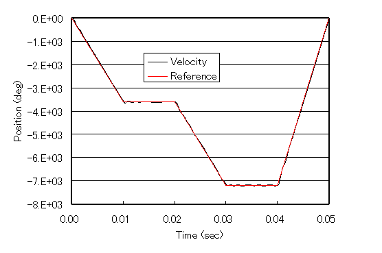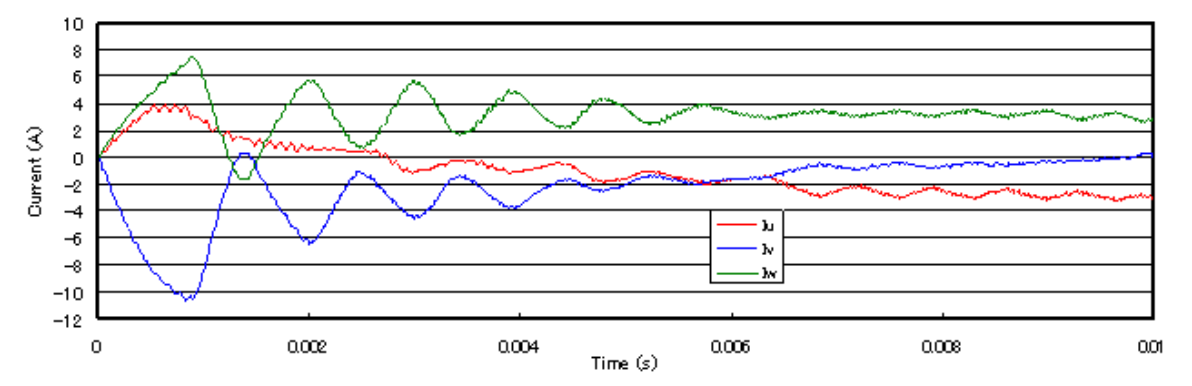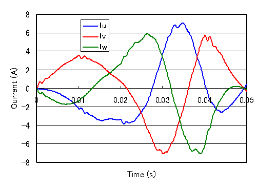 Fig.20に速度指令と結果としての速度変化を比較しています。非常によく一致しており、制御回路がうまく働いています。Fig.21に各相の電流変化を示します。