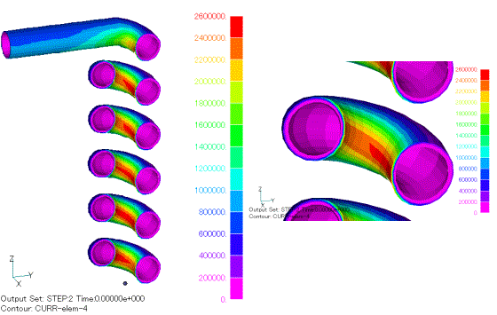 本モデルによる解析結果を以下に示します。Fig.4,5に導体中の電流密度を示します。電流はコイルの内径側に集中し、Fig.5の拡大図では表皮効果が見られます。Fig.6に断面の磁束密度強度の分布を示します。
