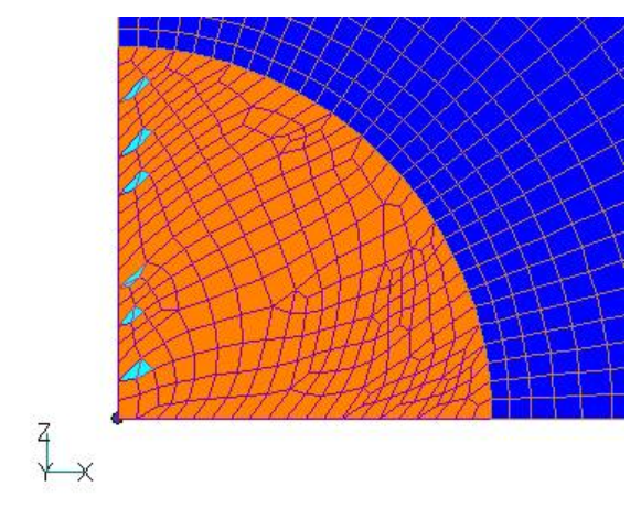 その例をFig.1、2に示します。Fig.1は球内部分を自動メッシュ分割によって生成した二次元メッシュです。いくつかの1点で軸に接する四角形が生成されています。従来この様なメッシュでは、ワーニングを出して実行を中止しておりました。今回の改良で、Fig.2に自動的に変換されるものとしました。短い方の対角線で四角形が二つの三角形に分割されます。その結果は、post_geomに新しいメッシュとして出力されます。