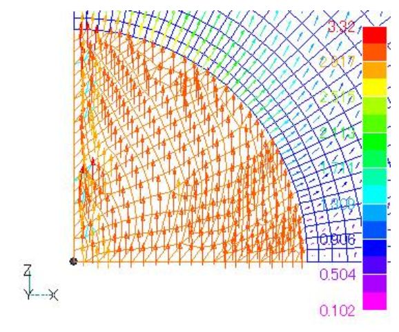 Fig.3はこのメッシュに寄って静磁場解析した結果を示しています。半径0.1m、比透磁率1000の球体に1Tの一様磁場が加わった場合を模擬しています。要素のゆがみが有るために若干磁場が揺らいでいますが、ほぼ一様な磁場が解析されています。称計算だけでなく、回転押し出しをするGIOMETRY=2,3の場合や、2D_to_3Dを用いて回転方向に押し出す場合(GEOMETRY=4)に適用されます。このことにより、若干でもお客様の負担を少なくできると考えます。