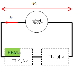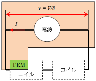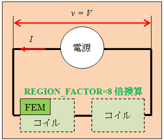 Fig.3に,直列接続の場合のREGION_FACTOR=1と8の時の回路とFEMコイルとの関係を示します。REGION_FACTOR=1の場合,FEMコイルに全体の1/8の電圧となり,REGION_FACTOR=8の場合,全体領域に換算した電圧となっていることを示しています。