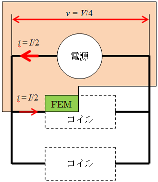 上下のコイルが直列接続されているとして考えます。印加する電流は部分モデルであっても全体モデルと同じ電流が流れることになります。