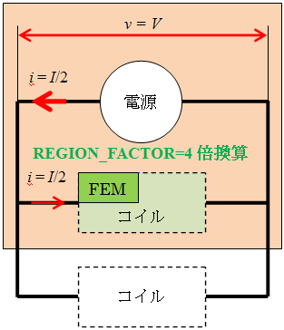 Fig.4に,並列接続の場合のREGION_FACTOR=1と=4の時の回路とFEMコイルとの関係を示します。REGION_FACTOR=1の場合,FEMコイルに全体の1/4の電圧となり,REGION_FACTOR=4の場合,全体領域に換算した電圧=一並列分の電圧となっていることを示しています。