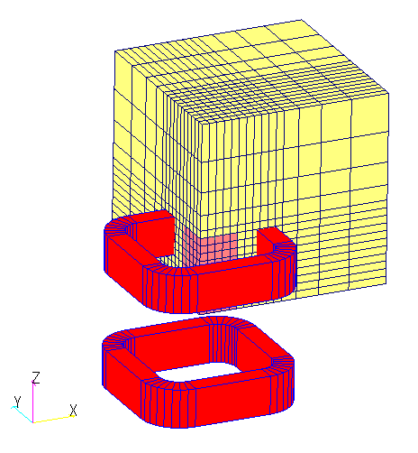 例として,Fig.1で示した鉄心,コイルモデルをCOILによりモデル化してみます。Fig.7に有限要素メッシュとCOILを示します。コイル抵抗は外部抵抗として入力します。