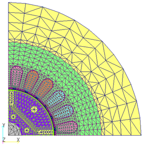 次に,具体的な例とし,IPMSMである電気学会ベンチマークモデルであるDモデルとD1モデルを用いて説明します。Dモデル,D1モデル共に体格,容量等が同じ4極のモータで,Dモデルが分布巻24スロット4直列接続,D1モデルが集中巻6スロット2並列接続ですので,D1モデルでREGION_PARALLELの使用法を説明します。Fig.5に,二次元有限要素メッシュを示します。Dモデルは1極分90度モデル(1/4),D1モデルは2極分180度モデル(1/2)となっています。どちらも三相交流がY結線されて印加されます。1,500$min^{-1}$(50Hz)定格速度時の,無負荷誘起電圧,電流源による定格通電条件での解析について,NETWORKを用いて示します。参考までに,Dモデルの三次元メッシュとU相コイルモデル例をFig.6に示します(コイルはCOILでモデル化しています)。