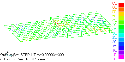 Fig.2は、解析された位相ゼロにおける渦電流分布を示します。ソリッド要素側と面要素側でほぼ対称な電流分布となっており、非磁性薄板要素による近似が妥当なものとなっています。Fig.3は節点力法によって求めた電磁力密度分布を示します。Fig.4は新たに機能として設けた、ローレンツ力による電磁力密度分布です。節点力法よるものと、ローレンツ力によるのものは、面要素側でも良く一致しています。