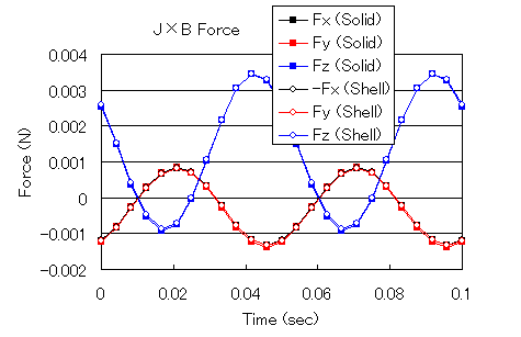 以上のように、ローレンツ力による電磁力の解析結果は、節点力法によるものと良く一致し、妥当なものとなっています。本来、非磁性導体においては、ローレンツ力と節点力法による電磁力は一致すべきものですが、数値誤差で一致が良くない場合も少なくありません。面要素による近似でも、両者の比較ができるようになり、電磁力の精度検討に役立てるかと考えます。また、強磁場中で微弱な磁場変動があった場合、節点力では精度が出せない場合があります。本来出るはずが無い静磁場下でも節点力による電磁力が計算されてしまうことがあります。このような場合には、ローレンツ力による計算がより妥当なものと考えられます。 ローレンツ力と節点力の関係については、こちらをご参照ください。