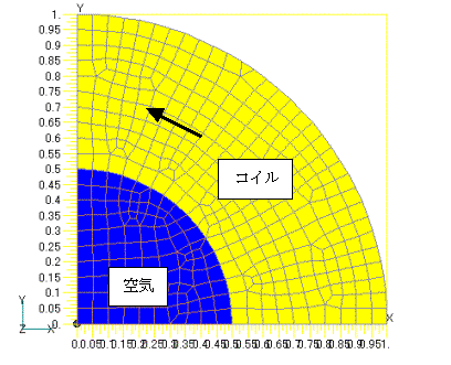 無限長ソレノイドコイルの静磁場解析例を示します。本来二次元の解析ですが、xy面内に電流が流れ、一層のメッシュを用いた三次元解析を行います。