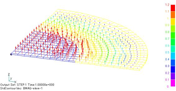 次に、電流ソースの定義ですが、このような不規則メッシュの場合は、SDEFCOIL(表面定義電流)による定義が適しています。Fig.3に定義されたコイル表面メッシュを示します。コイルを囲む4面をそれぞれ違う物性で定義します。面は、コイルに向かって内側向きに方向付けられています。Fig.4にこの定義によるコイル電流密度分布を示します。 Fig.5、6にEMSolutionにより計算された、磁束密度分布を示します。予想された磁場が計算されています。ただ、メッシュのゆがみの大きいところで誤差がみられます。Fig.7に全要素の磁場値と理論値の比較を示します。全体的には、よい一致を示していますが、かなり、誤差が大きくでています。より精度が必要な場合は、メッシュを細かくするなり、要素形状のゆがみの小さいものにする必要があると思われます。