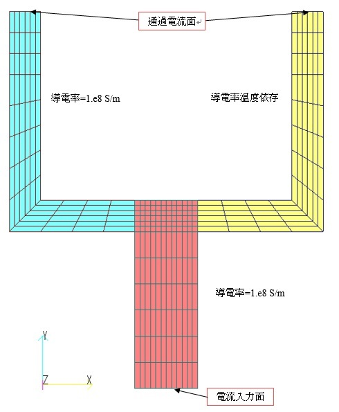 "バルク導体の直流電流場解析"で使用しました,Fig.1に示す二分岐する導体を模擬したモデルを用いて本機能を説明します。分岐する二つの形状は同じですが,片側が温度上昇するとして導電率を小さくしています。入力電流として分岐前の下面に90Aの直流電流を印加して解析します。Fig.2に使用する温度―導電率曲線を示します。非常に短時間で温度上昇するとしていますが,サンプル計算用ですのでご容赦ください。