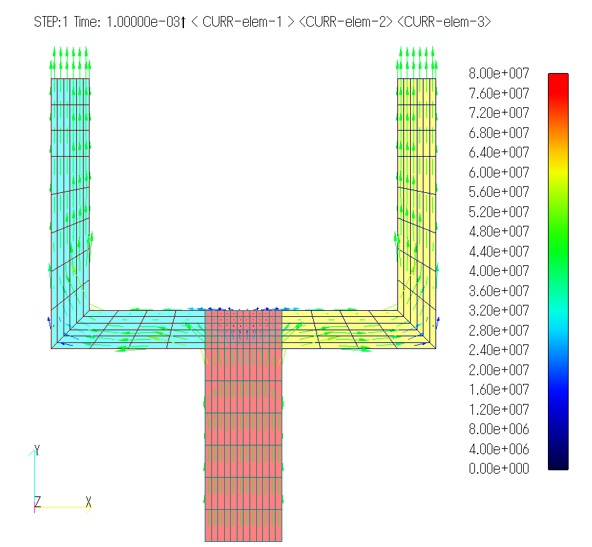 Fig.3に時刻0.001秒,0.005秒,0.01秒の電流分布を示します。左側分岐は導電率が変わらないため,徐々に定常状態に近づいているのに対し,右分岐は導電率が変わるため,逆に電流が小さくなっていくことがわかります。