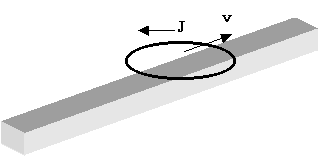 直流場渦電流解析では、Fig.1.1、1.2の様に電気特性が一様な導体が一定速度で一方向に運動する場合や、あるいは回転している場合に、時間的に一定の磁場を加えた場合の定常状態を求めます。外部 (励磁源に固定された座標系)から見ますと、磁場や導体に流れる渦電流は時間的に変動しないように見えます。一方、運動している導体に固定された座標系から見ますと、磁場が時間的に変動しており、このため渦電流が発生します。