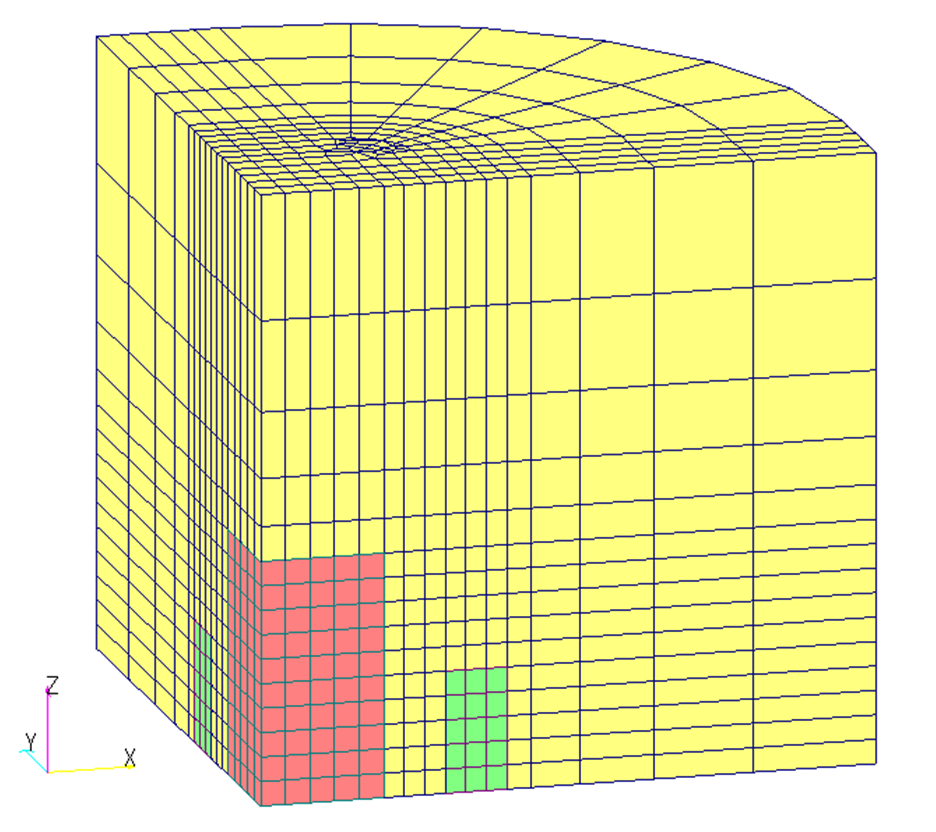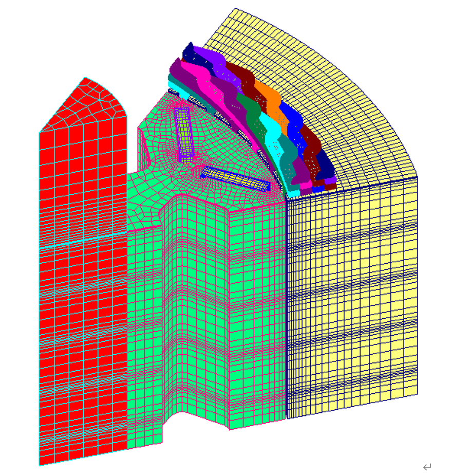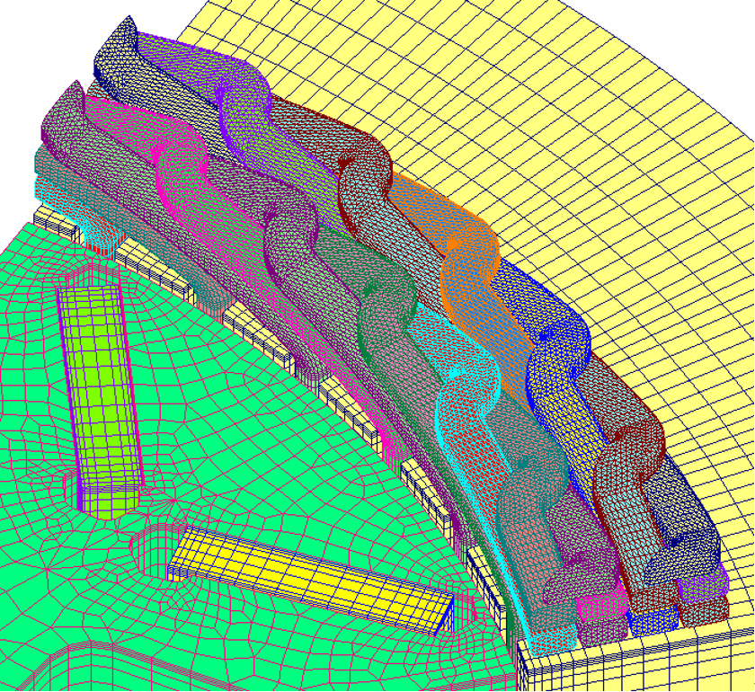 次に,三次元解析を実行します。Fig.6に三次元モデルを示します。コイルはPHICOILとSUFCUR2で設定します。二次元モデルではコイル領域全てをPHICOILもしくはSUFCUR2と設定し,回路で接続していましたが,Fig.6(c)に示すように三次元モデルでは(反)周期境界面で接続されるコイルプロパティがあるため,軸方向対称面のどちらかを設定することになります。