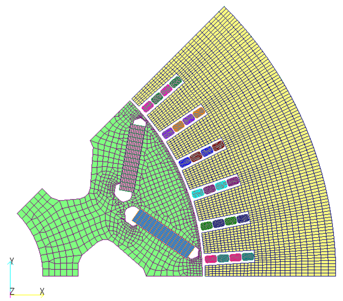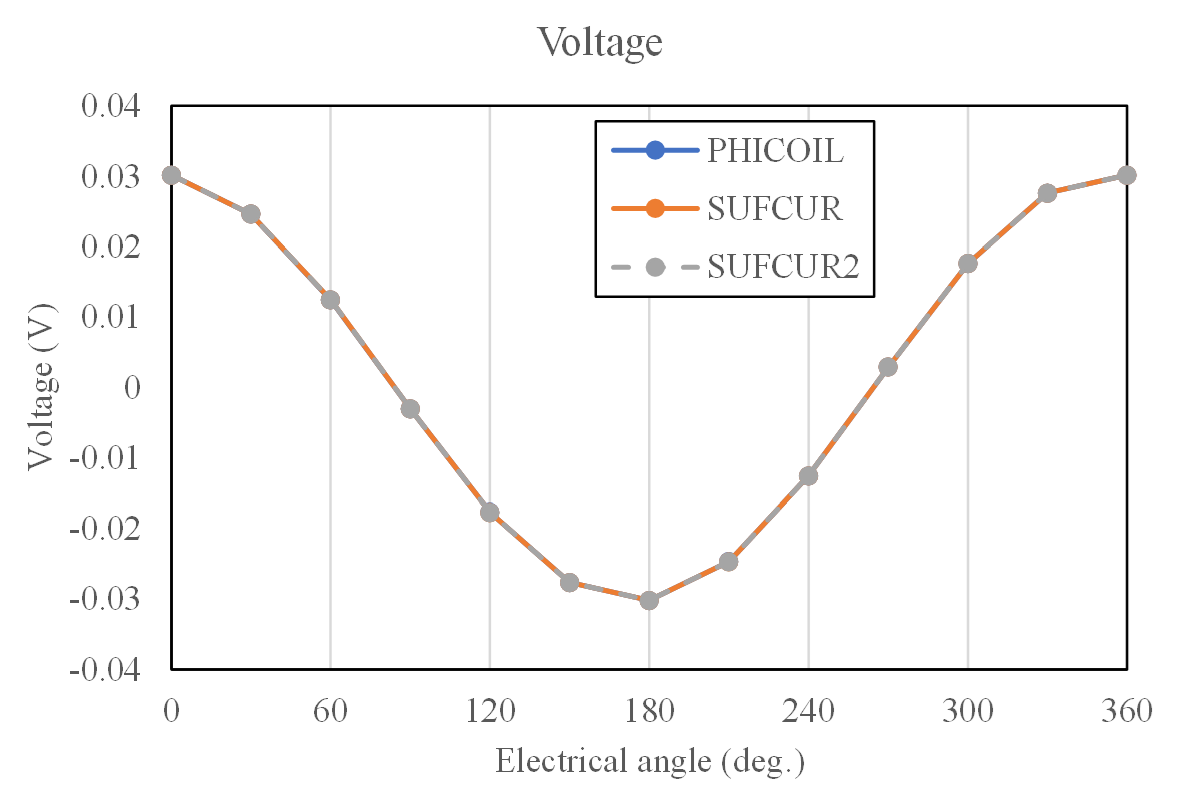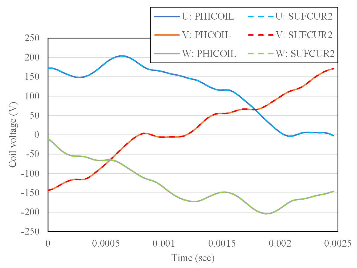 次に,Fig.3に示す平角コイルを用いたIPMモータで同様の解析を行ってみます。SUFCURは静磁界解析(Static)では使用できないため,計算初期の数値的な過渡状態を除くために最初にPHICOILで初期値を求めてリスタート解析を行います。ここでは簡単のため正弦波電流源解析を実行し,計算結果として得られる電圧波形とコイル鎖交磁束を比較します。