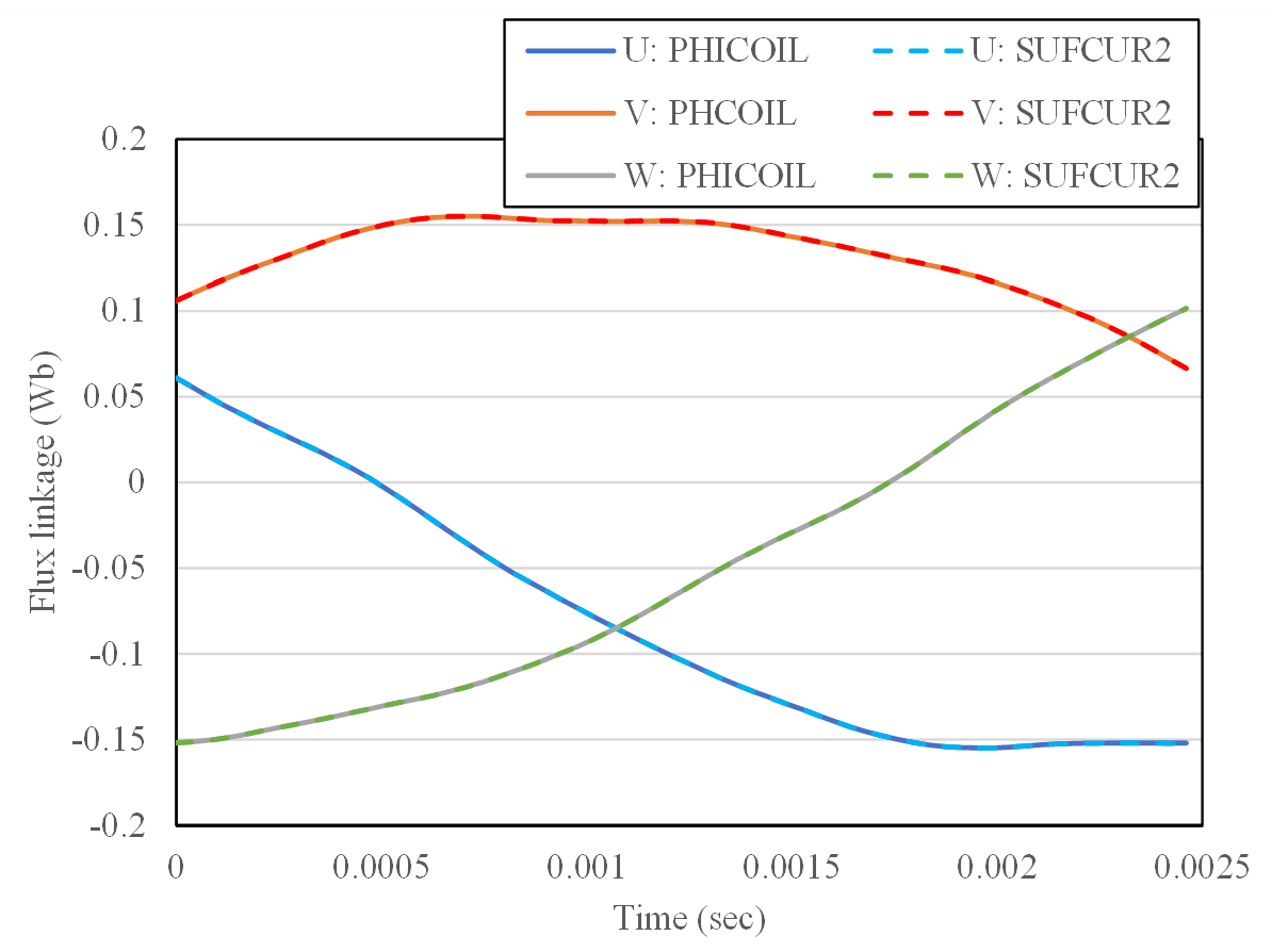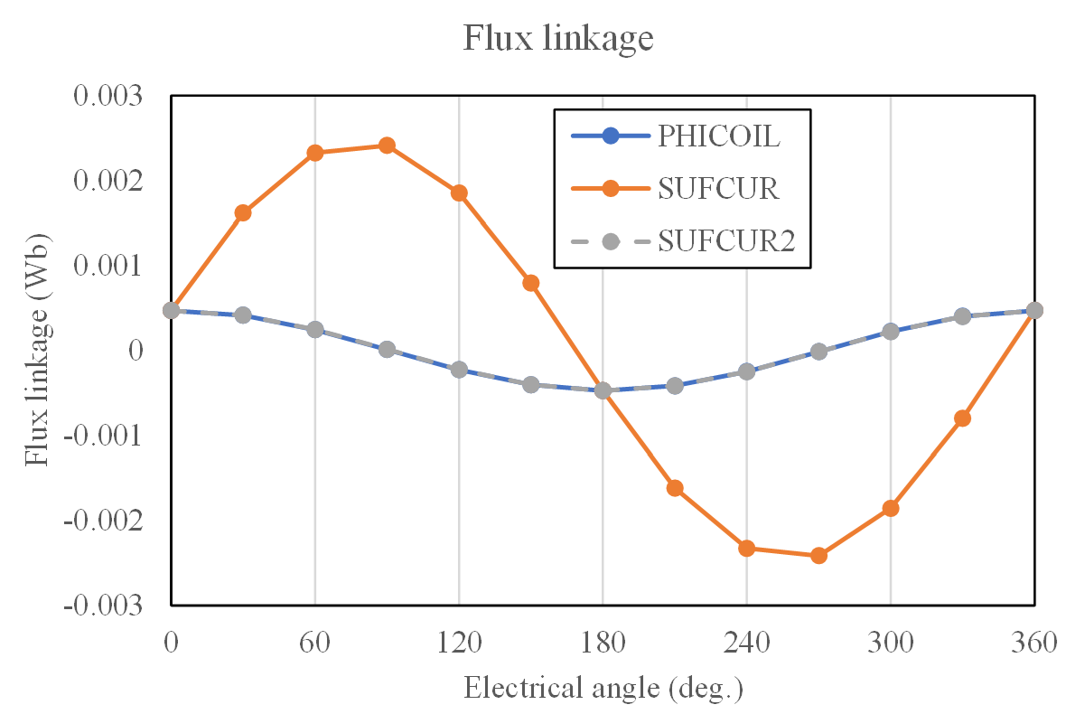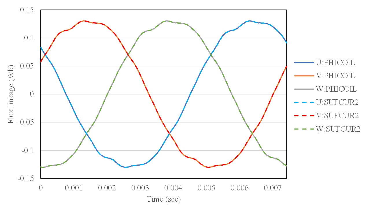 Fig.7に100Arms, 60deg, 2000min-1時のコイル鎖交磁束を示します。渦電流の影響は小さく,PHICOILとSUFCUR2でよく一致することが確認できます。