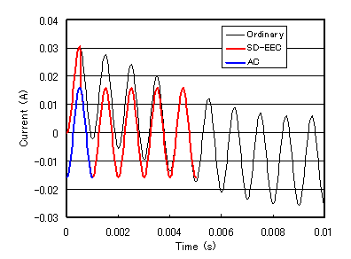 まず、簡単な場合として、磁場計算は含まず、次の様な電気回路のみの場合を考えます。EMSolutionでは回路のみの解析もできます。電圧源に100V、1kHzの電圧を加えますと、電流の時間変化はFig.2のようになり、1周期20ステップで1000ステップ計算しても定常に達していません。初期値を0として解析したためですが、一般的には仕方がありません。これに対し、SD-EEC法を適用しますと、Fig.3のように半周期後(10ステップ)でほぼ定常の状態になり、SD-EEC法が非常に有効であることがご理解いただけると思います。本解析はAC定常解析でできますので、比較しますと良く一致しています。この場合のように線形解析ですとAC定常解析が適用できますが、回路素子が非線形の場合や、鉄などの非線形有限要素法と連成するにはAC定常解析は適用できず、過渡解析を行わなくてはなりません。
