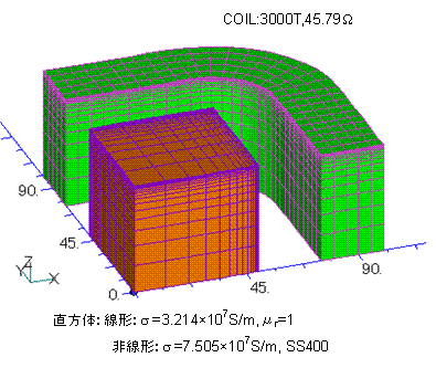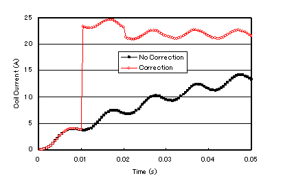 本手法は非線形磁気特性を含む場合や、回路が連成した場合にも適用できます。Fig.6に適用モデル例を示します。立方体形状の磁性体に外部から電圧源で磁場を加えます。印加電圧は、1000(V){1-cos(wt)}と直流分を含む電圧とし、周波数は100Hzとしました。この場合のコイル電流の解析結果をFig.7に示します。通常の方法(No correction)では100ステップ後でも未だ定常までは程遠いですが、SD-EEC法(Correction)では、二回の補正後である40ステップで定常状態に収束しています。