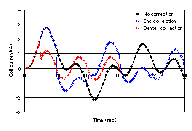 次に,電気回路に10μFのコンデンサを直列に接続し,意図的に回路の時定数を長くしてみます。Fig.8,9にコイル電流とジュール発熱を示します。補正を行わない場合(No correction),一周期の最後のステップを補正した場合(End correction)と半周期前のステップを補正した場合(Center correction)の比較を示しています。Center correctionでは一周期の後半はプロットされていないため、実際はほぼ2倍のステップが計算されていることにご注意ください。No correctionはもちろんなかなか定常に収束しませんが,End correctionでも100ステップ、5度の補正を行っても未だ定常に収束しておりません。一方、Center correctionでは、3度の補正(60ステップの計算)でほぼ定常に達しています。 このようにN_BACKを使用すると,一周期ごとに補正を行うSD-EEC法よりも効果があります。注意点として,この解析のように磁気非線形性はそれ程強くなく,回路の時定数により定常までの解析時間が決まる場合は,半周期前のステップで補正するN_BACKが効果的なようです。逆に磁気非線形性が強い場合は,半周期前のステップで補正することが必ずしも有効ではなく,他のステップ戻る補正や一周期ごとの補正の方が効果的な場合があるようです。